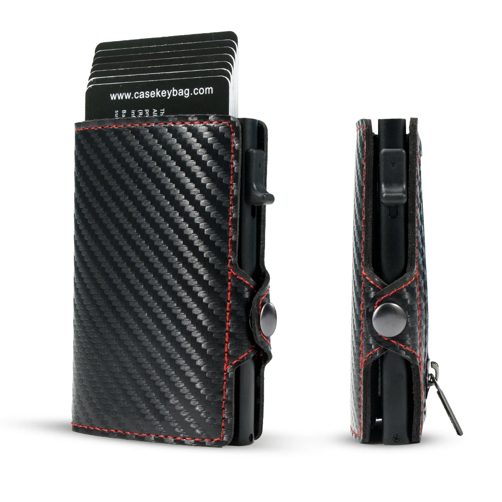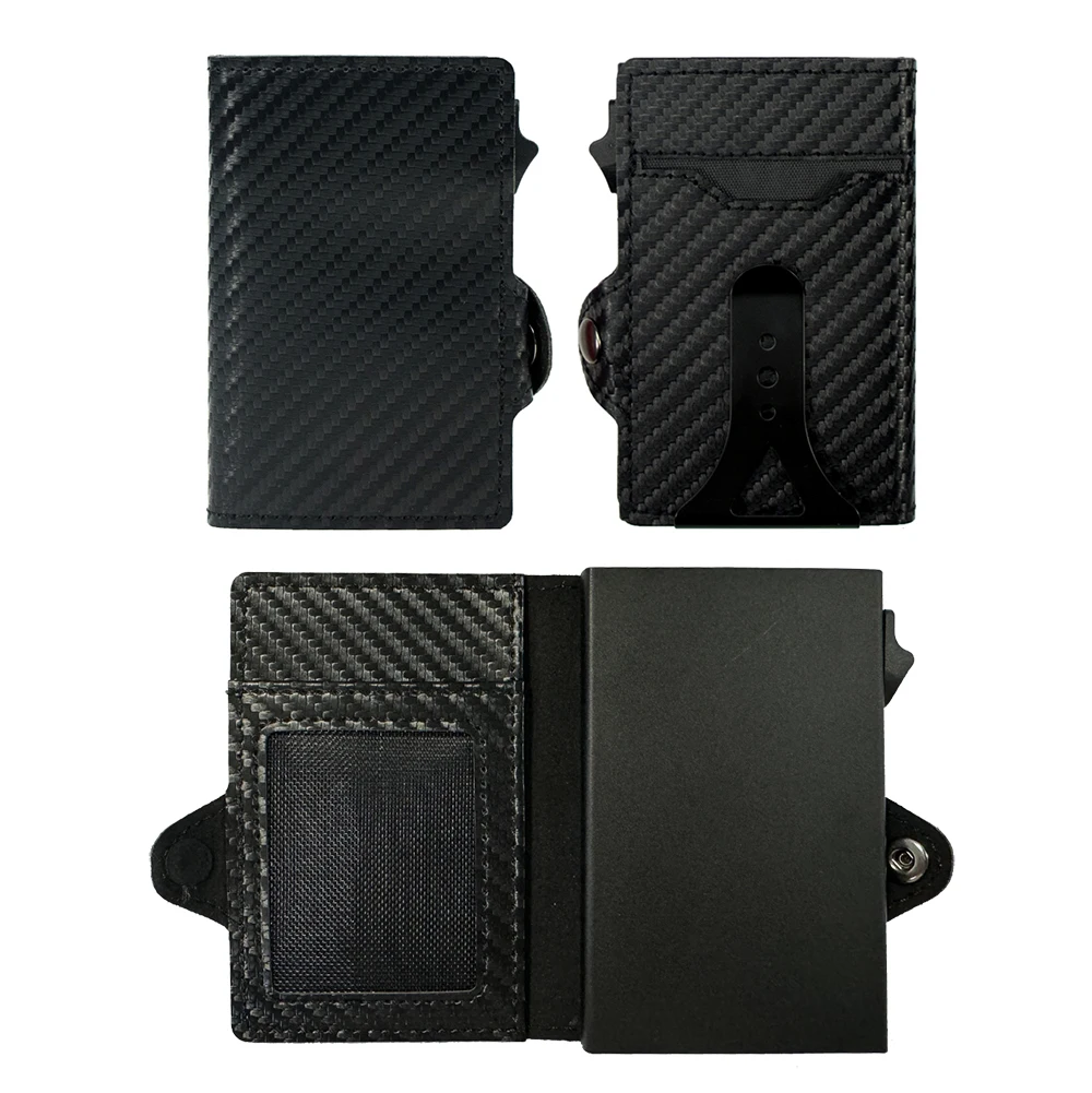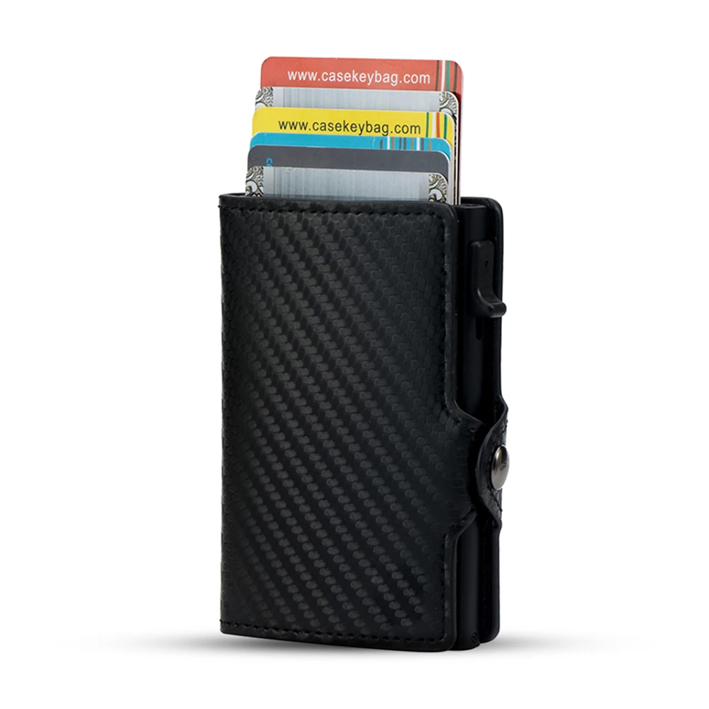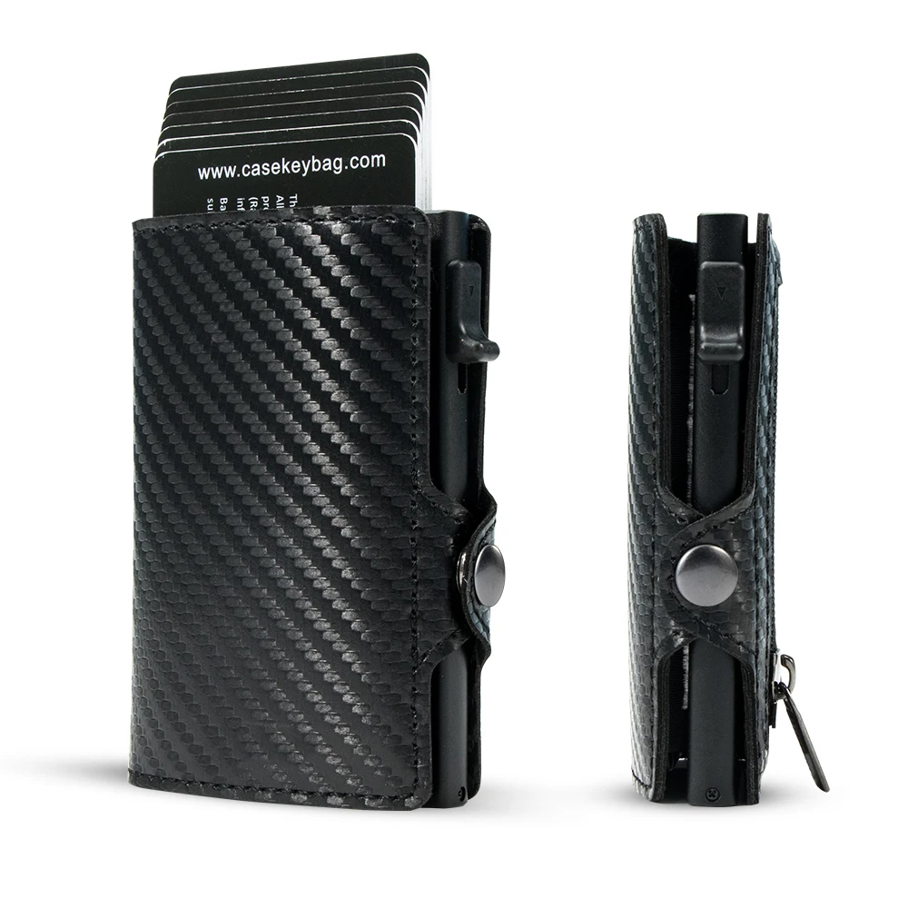 The pop-up mechanism allows instant access to your cards with a single click, making it fast and convenient for daily use. The carbon fiber finish adds a premium, sleek look, perfect for both casual and professional settings.