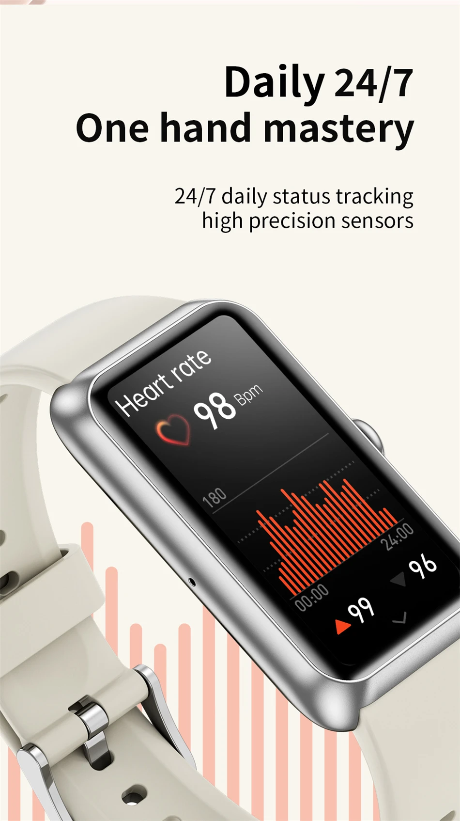 Powered by Bluetooth 5.3 low-energy technology, this smart band delivers efficient performance with a 180mAh battery and smooth interface experience up to 60 FPS.